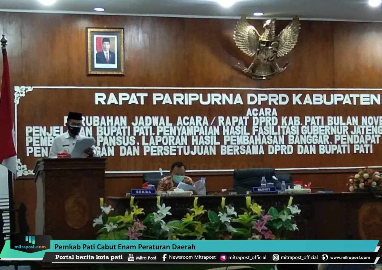 Pati, Mitrapost.com – Dewan Perwakilan Rakyat Daerah (DPRD) Kabupaten Pati hari ini menggelar rapat paripurna tentang pencabutan enam Peraturan Daerah (Raperda), Kamis (26/11/2020).