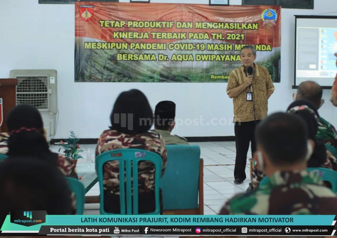 Acara ini sendiri menghadirkan motivator nasional Aqua Dwipayana pada hari ini, Kamis (7/1/2021). Kehadiran motivator di Markas Kodim Rembang dalam rangka memberikan ilmu komunikasi serta motivasi kepada Prajurit Kodim di Aula Gedung Manunggal di Jl. Diponegoro no. 73 Rembang.