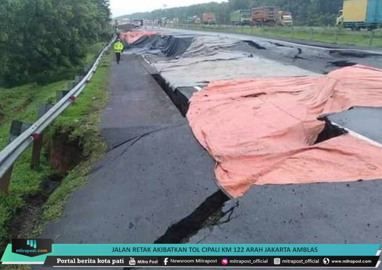 Indramayu, Mitrapost.com Jalan Tol Cikopo-Palimanan (Cipali) KM 122 arah Jakarta mengalami retak hingga membuat tanah amblas.
