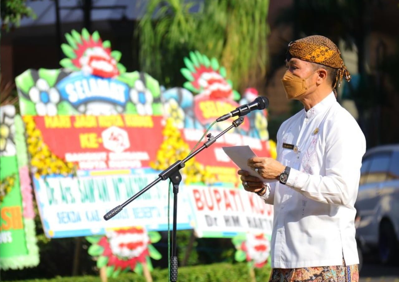Bupati Kudus Hartopo, bertindak sebagai pimpinan apel yang diikuti oleh puluhan peserta yang terdiri dari unsur Forum Komunikasi Pimpinan Daerah (Forkopimda), perwakilan instansi terkait dan kecamatan.