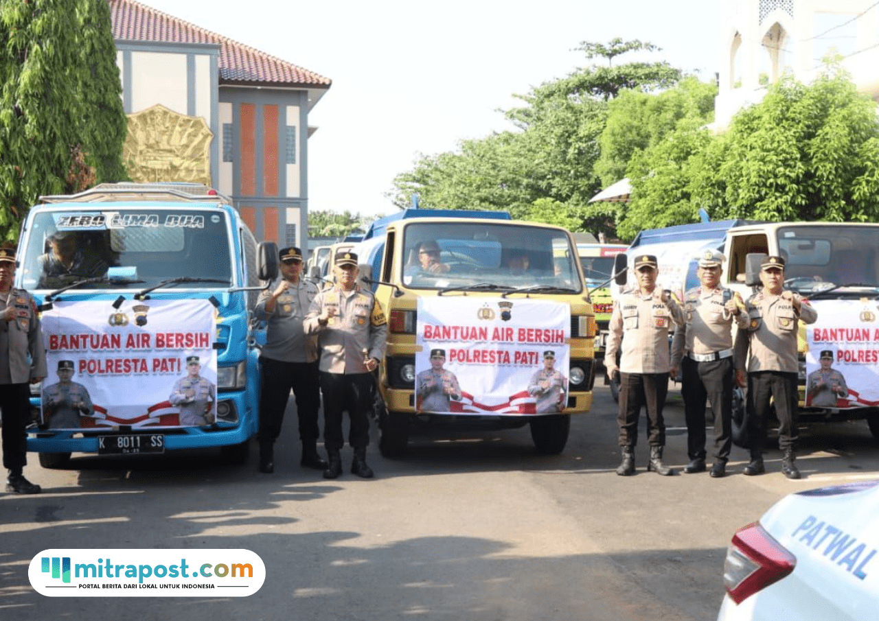 Pati, Mitrapost.com – Polresta Pati menyalurkan bantuan air bersih kepada warga yang terdampak kekeringan pada 3 Kecamatan di Kabupaten Pati, Jumat (20/09/2024). Sebanyak 12 tangki air bersih disalurkan untuk mengatasi kekeringan di daerah tersebut.