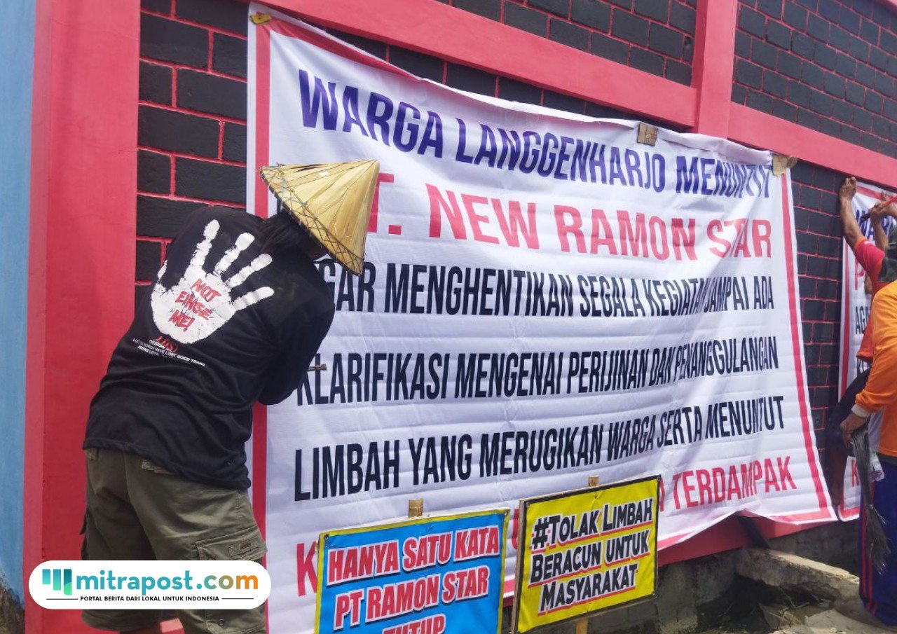 Banner yang dipasang di tembok depan tersebut bertuliskan ‘Warga Langgenharjo Menuntut PT New Ramon Star Agar Menghentikan Segala Kegiatan Sampai Ada Klarifikasi Mengenai Perizinan dan Penanggulangan Limbah yang Merugikan Warga Serta Menuntut Kompensasi Untuk Warga Terdampak’.