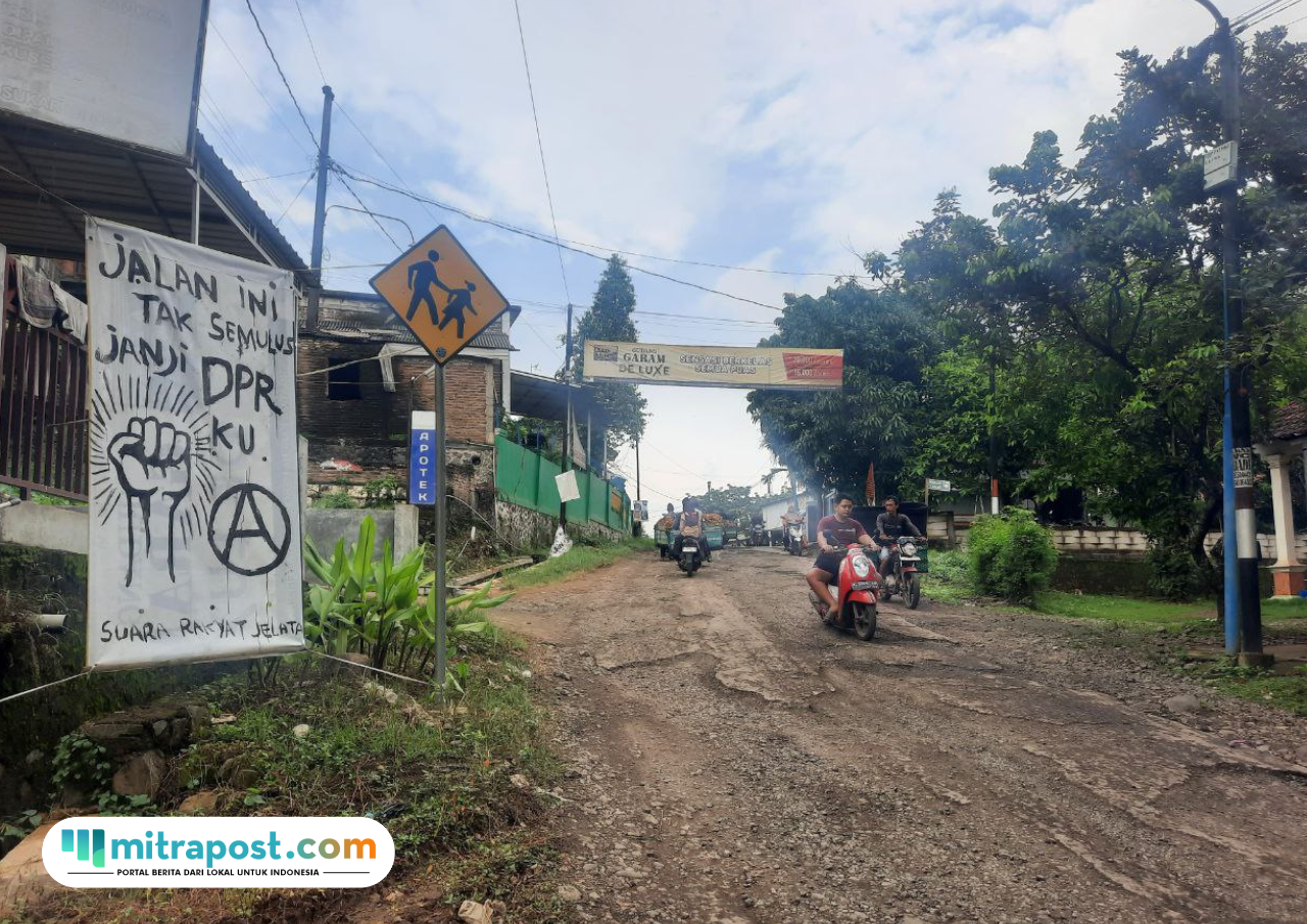 Sejumlah tulisan bernada protes pun terpasang di pinggir jalan, seperti “pastikan kendaraan anda bisa terbang melewati jalan ini, “jalan ini tak semulus janji DPR-ku”, hingga “katanya ada pemda jalan rusak aja dibiarin saja”.
